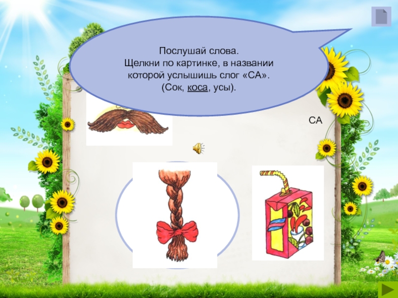 Послушай слова.Щелкни по картинке, в названии которой услышишь слог «СА».(Сок, коса, усы).СА
