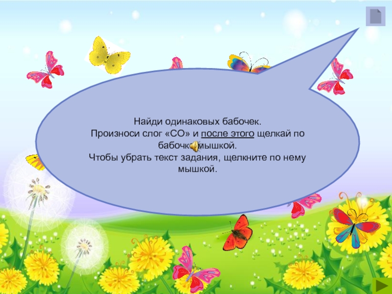 Найди одинаковых бабочек.Произноси слог «СО» и после этого щелкай по бабочке мышкой.Чтобы убрать текст задания, щелкните по