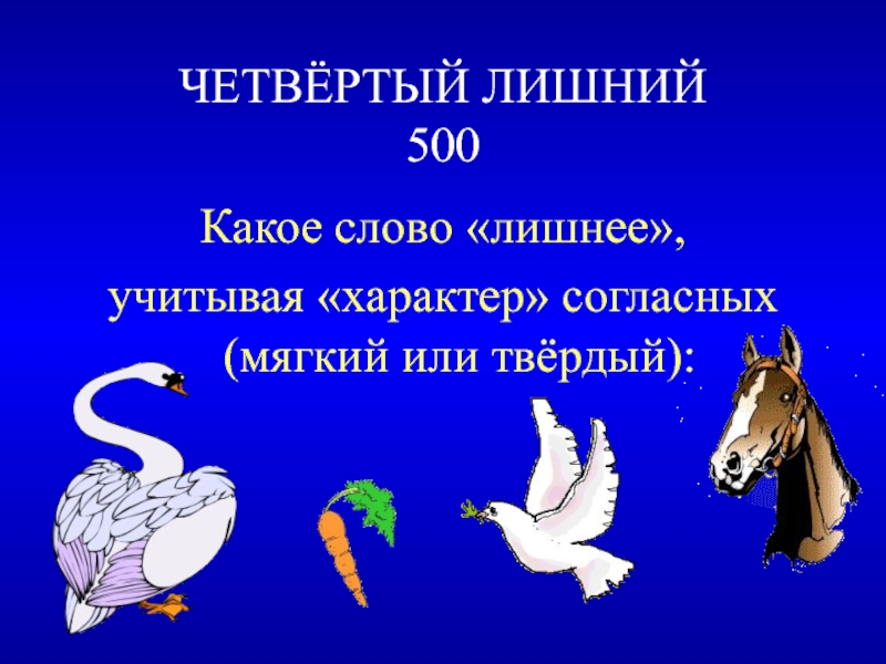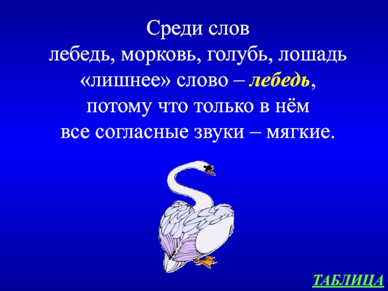 лебедь, морковь, голубь, лошадь «лишнее» слово – лебедь,