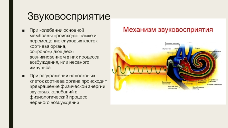 круглого окна (вторичная барабанная перепонка), жидкость лабиринта (перилимфа), основная мембрана.Звуковые волны, проникнув в слуховой проход, приводят в содружественное колебание барабанную перепонку, которая передает звуковые колебания через цепь слуховых косточек в овальное окно и далее перилимфе внутреннего уха.